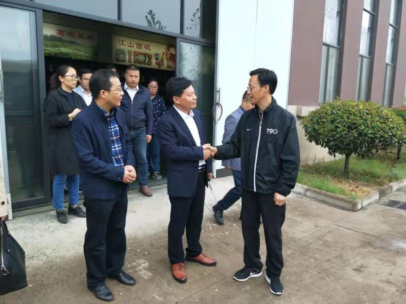 2019年10月26日,由四川省乐山市沐川县委书记鲁力率领的党政代表团来浙江红盖头农业科技有限公司考察指导。由江山市市长舒畅等领导陪同调研。代表团边走边看,饶有兴趣地参观了展示区内葛饮料、猕猴桃饮料、野葛粉等各类葛根制品,并深入生产车间参观葛根饮料的生产制作流程,仔细询问了产品的生产、开发等情况。代表团表示,目前双方已开展农产品方面的交流合作,希望双方继续深化合作,拓宽领域,精深加工,形成更广泛的合作,扩大合作成果。